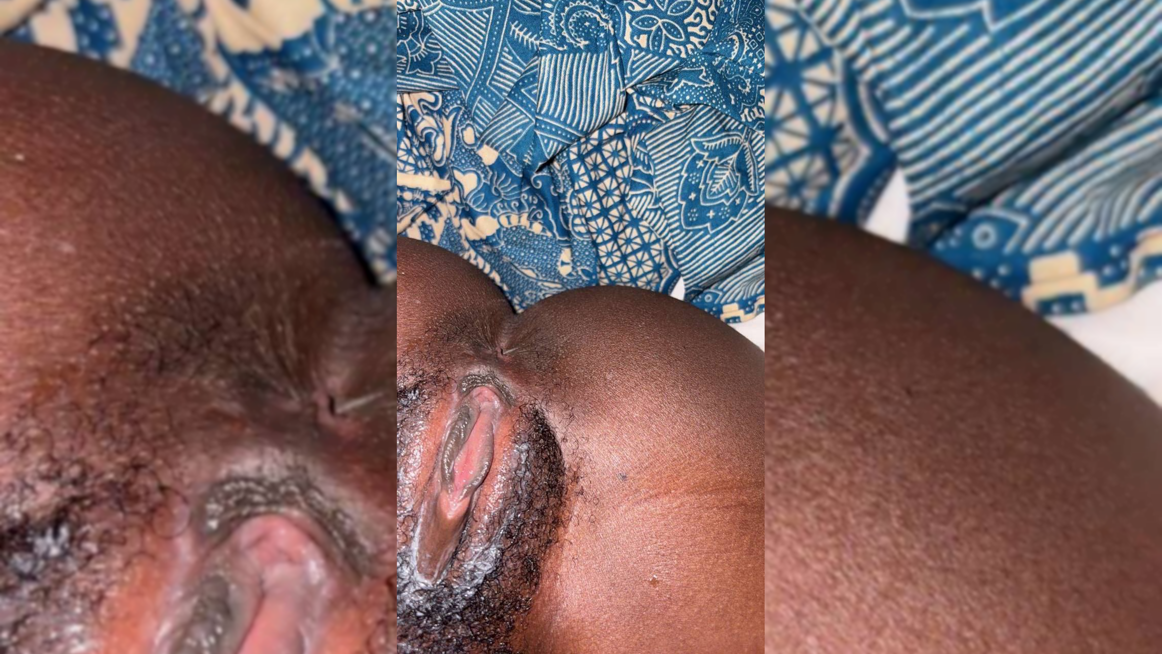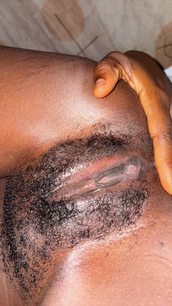 See below the amazing pictures of my cum on my clean and horny GF black pussy with shining pink clits.